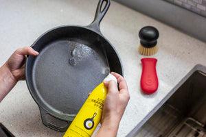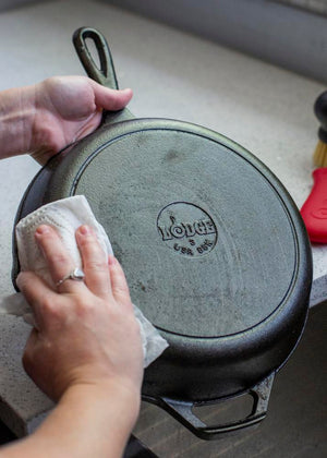 Lava tus utensilios de cocina de hierro fundido a mano. Puedes usar una pequeña cantidad de jabón. Si es necesario, utiliza un raspador para alimentos pegados. Para alimentos persistentes pegados, hierve un poco de agua durante 3-5 minutos y luego usa el raspador después de que la sartén se haya enfriado. Nuestro Kit de Cuidado del Condimento tiene todo lo que necesitas para lavar y cuidar el hierro fundido de la manera correcta.