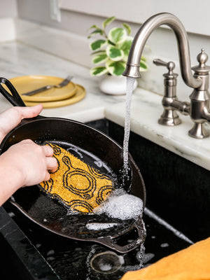 Contrario a la creencia popular, ¡puedes usar una pequeña cantidad de jabón para limpiar utensilios de cocina de hierro fundido! Grandes cantidades de jabón pueden eliminar el condimento de tu sartén, pero puedes volver a sazonarla fácilmente según sea necesario.