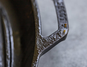 El óxido se forma cuando la batería de cocina está expuesta a la humedad durante largos periodos de tiempo y no es perjudicial en modo alguno. Si el hierro fundido se deja en remojo en el fregadero, se mete en el lavavajillas o se deja secar al aire, se oxidará. También puede ocurrir cuando almacena sus utensilios de cocina en ambientes propensos a la humedad, como un armario cerca de un lavavajillas, un armario abierto en un lugar húmedo, o almacenados al aire libre.